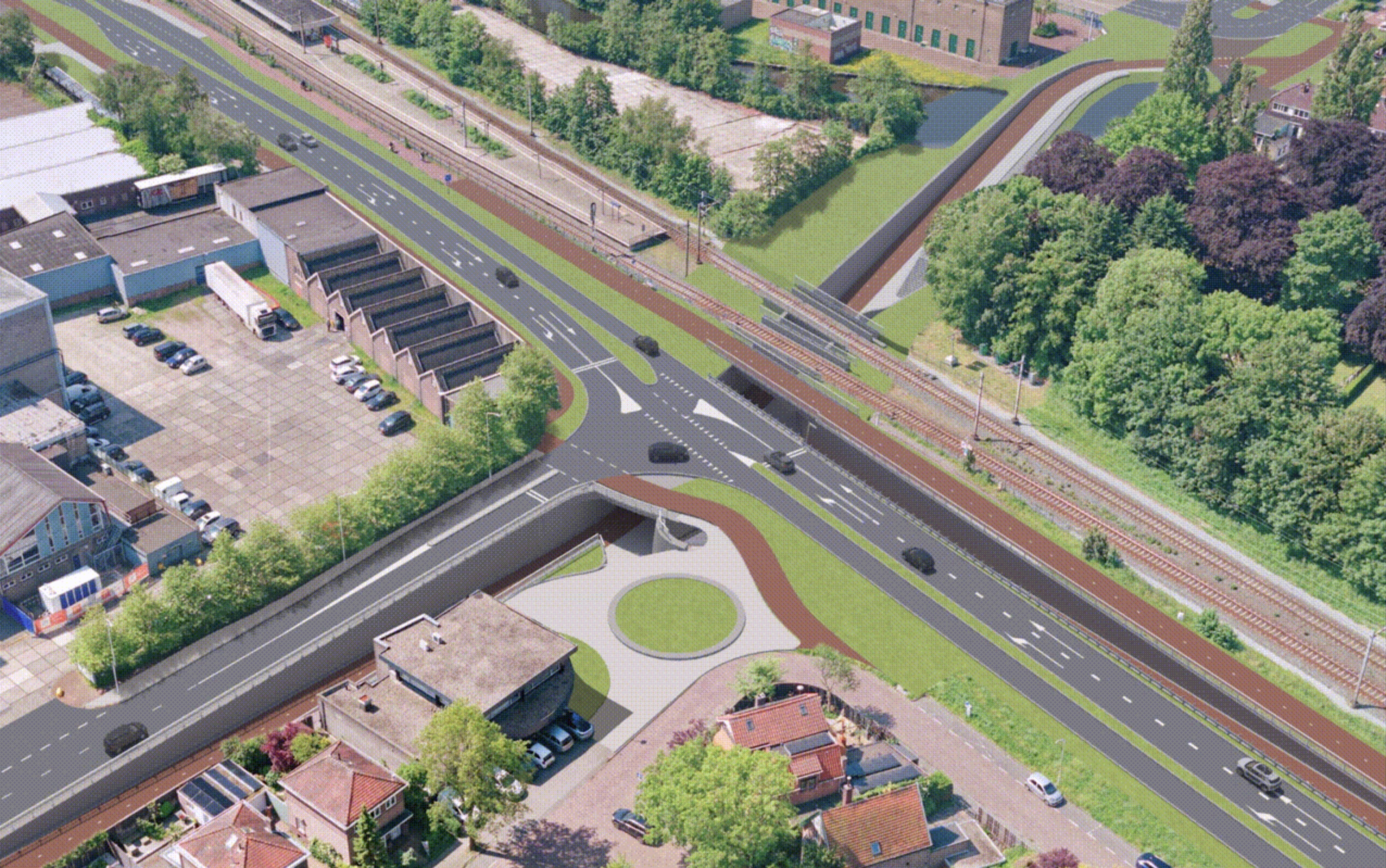 In deze oplossing gaat al het verkeer via de kruising Guisweg/Provincialeweg onder het spoor door, maar via aparte rijbanen voor gemotoriseerde voertuigen en fietsers/voetgangers.